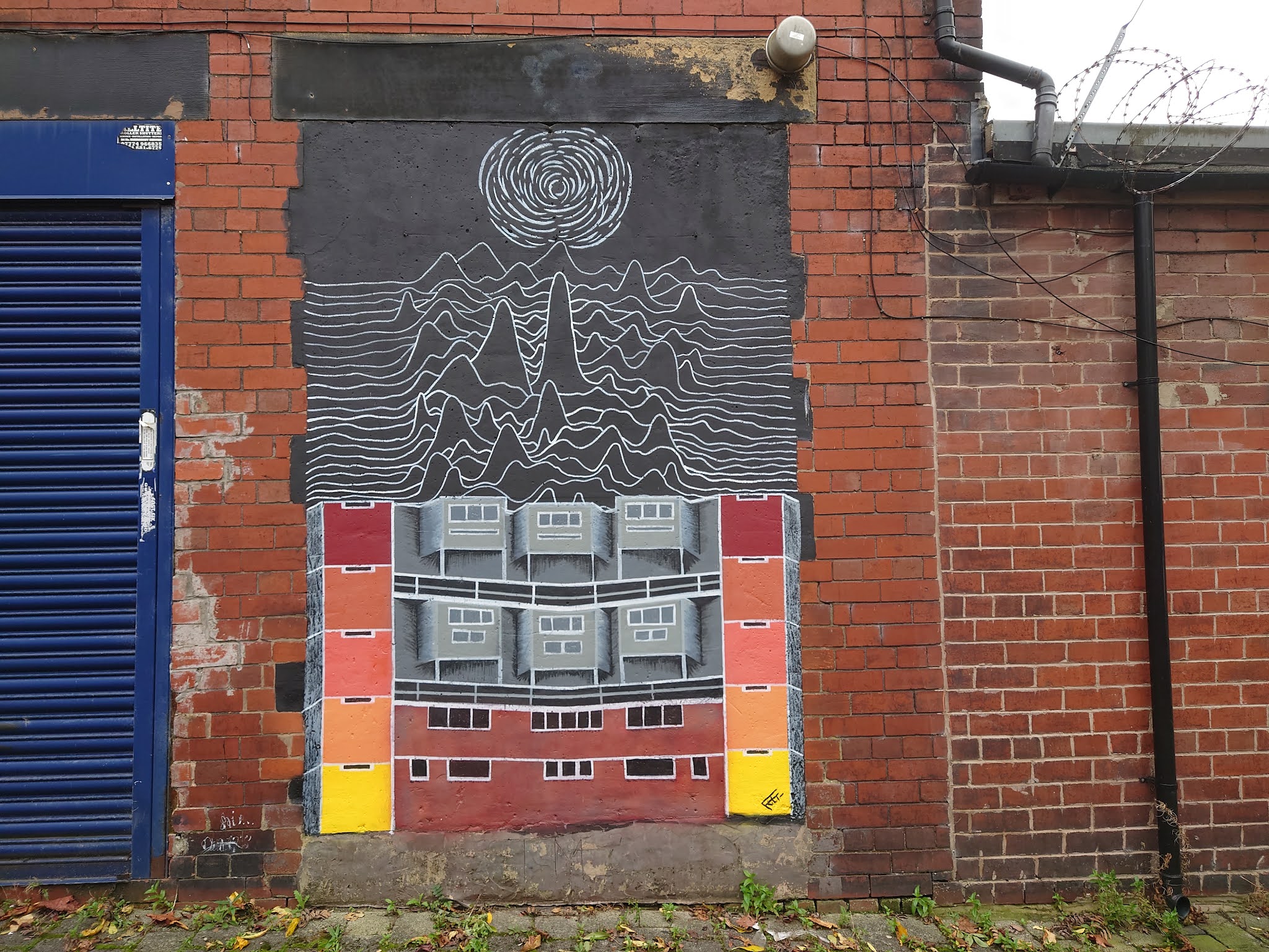 Another element of the mural celebrates Volta Lab Studios itself. An unassuming building it has a rich history as part of the Manchester music scene. Playing host to various iterations of recording studios of the years, it has recorded the likes of Joy Division, Happy Mondays, Elbow and the Stone Roses. The pulsing radio signal seen in her work is a reference to that. Taken from Joy Divisions 1979 album cover ‘Unknown Pleasures‘ it was recorded at the studio. A further random fact associated with that particular image is that it was taken from the first recorded pulsating signal recorded from deep space. It was discovered by Jocelyn Bell in 1967 and initially called LGM-1 (Little Green Men) as it was believed by others to be alien. It wasn’t of course but it’s an interesting story