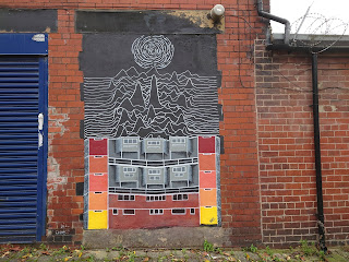 The mural also depicts a reference to Rochdales former Ashfield Valley Flats taking the form of a mixing desk. Famed for their links to the punk and alternative music scene they had nonetheless soon gained a notorious reputation which ultimately led to their demolition by 1992. Three of the tower blocks still survive in the town as Stoneyvale Court with the rest of the area becoming Sandbrook Park.