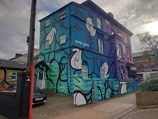 Back onto the main Victoria Road, Matt Dosa’s colourful work was partly Inspired by the nearby seaside. Covering the whole upper floor of three buildings. It uses a combination of shapes and colours. The piece is pure fun and is complete proof of the power of street art to transform an environment.